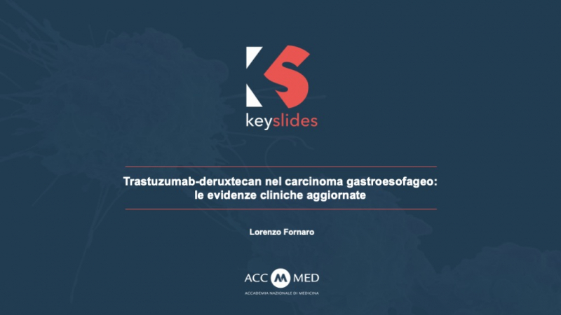 T-DXd è composto da un anticorpo monoclonale IgG1 umanizzato anti-HER2 (con la stessa sequenza di aminoacidi di trastuzumab) legato in modo covalente a DXd, un derivato di exatecan che agisce come inibitore della topoisomerasi I. Le evidenze cliniche dimostrano che T-DXd è un farmaco attivo ed efficace nel trattamento dell’adenocarcinoma gastrico e della giunzione gastroesofagea avanzato non resecabile o metastatico ed è oggi approvato e rimborsato per l’impiego in pazienti con malattia HER2-positiva dopo un precedente trattamento di prima linea contenente trastuzumab. Nelle diapositive sono presentati i risultati degli studi clinici che hanno condotto a questa approvazione e i dati di sicurezza ed efficacia provenienti da casistiche di pratica clinica. Infine, sono discussi i principali studi in corso, volti ad esplorare il ruolo di T-DXd in linee di trattamento o in fasi di malattia più precoci.