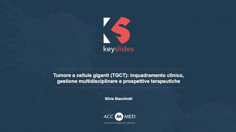 Il TGCT è un tumore raro, ma non eccezionale, che colpisce le articolazioni - spesso in pazienti giovani - e presenta un’elevata tendenza alla recidiva locale, in particolare quando coinvolge grandi articolazioni come il ginocchio. La comprensione dei meccanismi biologici alla base della malattia, in particolare del ruolo del recettore CSF1R, ha aperto la strada a nuove strategie terapeutiche. Tra queste, vimseltinib rappresenta il primo inibitore di CSF1R approvato in Europa per il trattamento del TGCT sintomatico non candidabile a chirurgia, dimostrando risposte radiologiche e cliniche nella maggior parte dei pazienti. In questo slide kit approfondiremo: l’inquadramento clinico, la gestione multidisciplinare e le prospettive terapeutiche del TGCT.